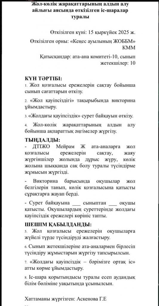 Жол-көлік жарақаттануының алдын алу мақсатында ата-аналар комитетінің кеңесі өтті. Кеңесте